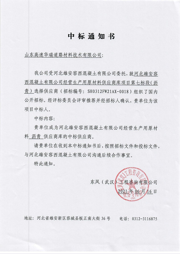 根據(jù)河北雄安容西混凝土有限公司2021年經(jīng)營(yíng)生產(chǎn)需求,瀝青標(biāo)段共需各類瀝青約2萬(wàn)噸(70號(hào)瀝青暫估需求量1.5萬(wàn)噸、改性瀝青SBS I-C暫估需求量0.1萬(wàn)噸、改性瀝青SBS I-D暫估需求量0.4萬(wàn)噸),華瑞公司以第二名的成績(jī)成功入圍其供應(yīng)商庫(kù)。