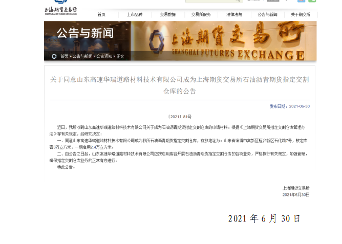 2021年6月30日,上海期貨交易所發(fā)布了《關(guān)于同意山東高速華瑞道路材料技術(shù)有限公司成為上海期貨交易所石油瀝青期貨指定交割倉庫的公告》,山東高速華瑞道路材料技術(shù)有限公司瀝青期貨交割倉庫成功獲批,核準(zhǔn)庫容為3萬噸,一期啟用2.4萬噸。