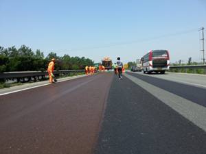 長(zhǎng)深高速(濱州段)微表處養(yǎng)護(hù)維修工程山東省養(yǎng)護(hù)重點(diǎn)工程之一,上圖為濱州養(yǎng)護(hù)處正在進(jìn)行微表處養(yǎng)護(hù)施工。施工后路面破乳時(shí)間短,路面強(qiáng)度上的快,減少了路面開放交通時(shí)間,得到了用戶的好評(píng)。