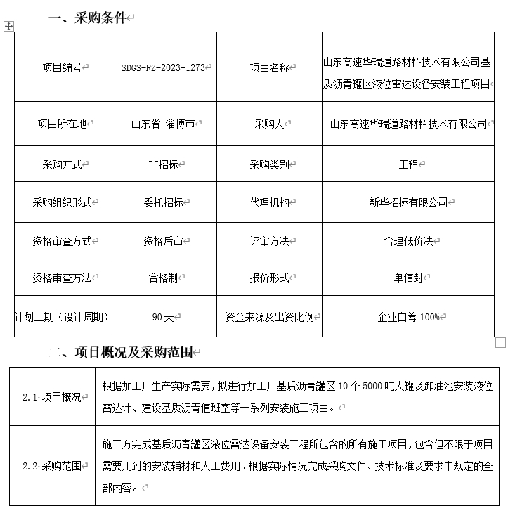 山東高速華瑞道路材料技術(shù)有限公司基質(zhì)瀝青罐區(qū)液位雷達設(shè)備安裝工程項目談判采購公告