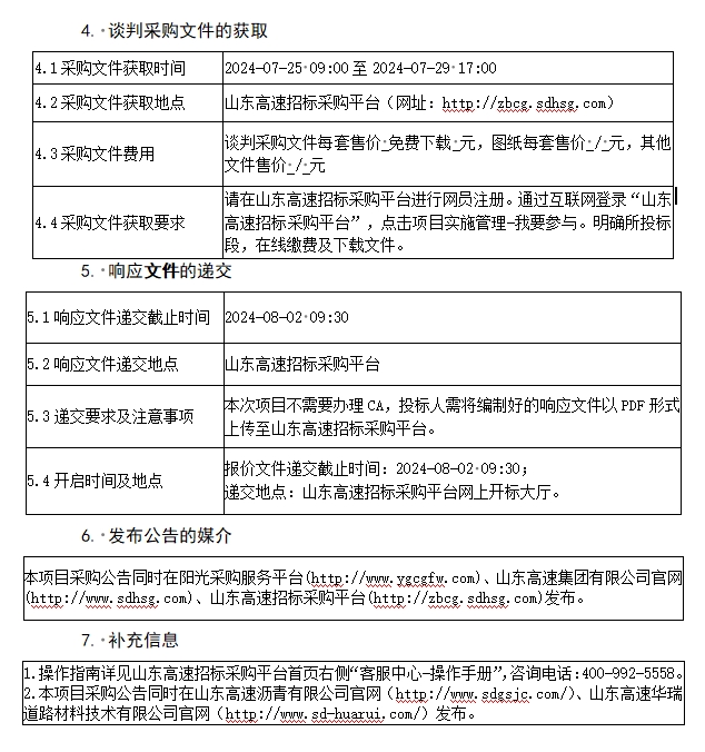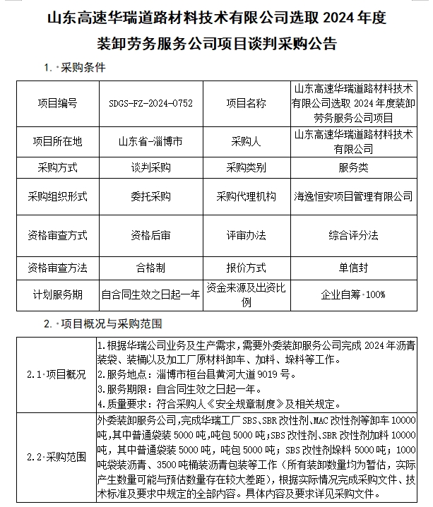 山東高速華瑞道路材料技術(shù)有限公司選取2024年度裝卸勞務(wù)服務(wù)公司項目談判采購公告